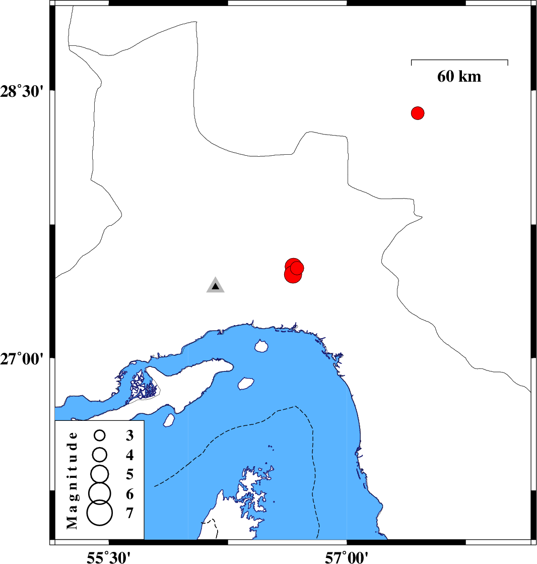 2018/03/21 12:33:09.9 16:03:09.9 27.51456.66315 ML4.8 Hormozgan Province, 58 km -West of Dehbarez