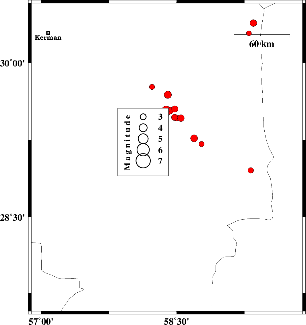 | 2018/03/06 | 00:04:47.5 | 03:34:47.5 | 27.628 | 58.364 | 15 | ML2.8 | Kerman Province, 75 km South-East of Kahnuj | ||