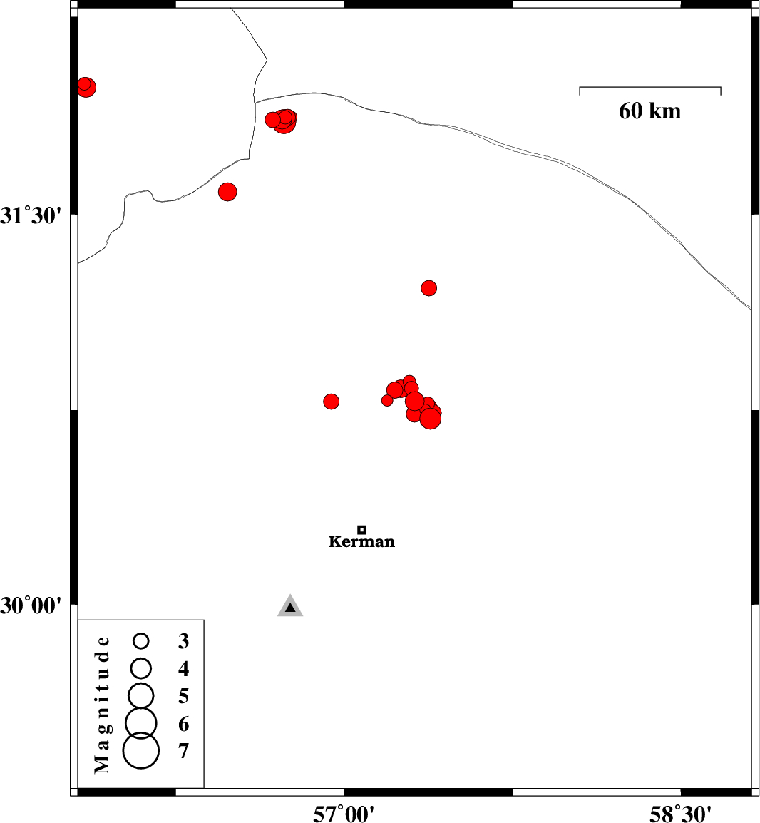 | 2018/03/04 | 11:35:27.1 | 15:05:27.1 | 30.708 | 57.38 | 14 | ML3 | Kerman Province, 55 km North-East of Kerman | ||