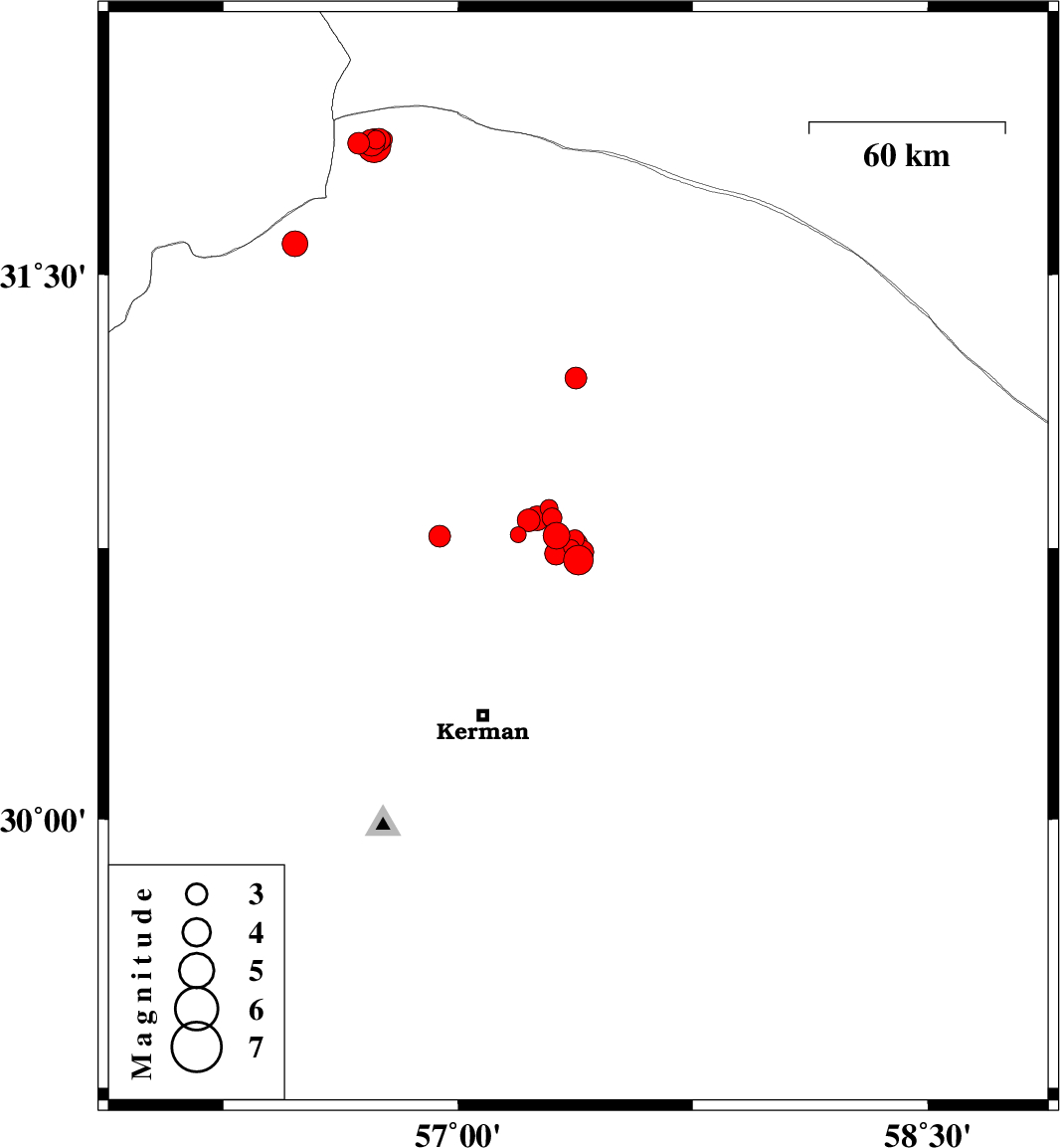 | 2018/03/04 | 11:35:27.1 | 15:05:27.1 | 30.708 | 57.38 | 14 | ML3 | Kerman Province, 55 km North-East of Kerman | ||