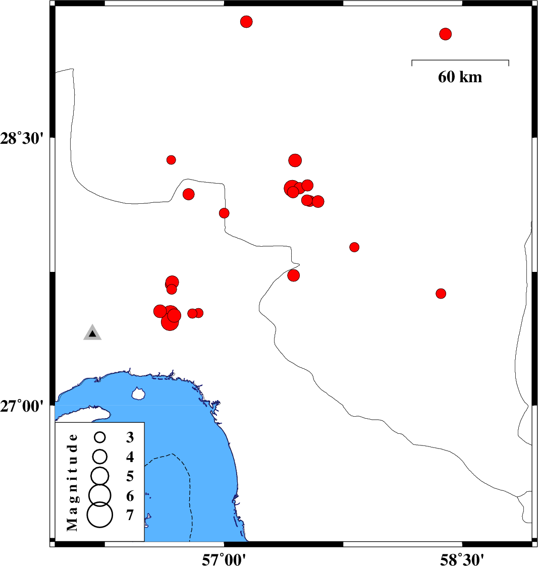 | 2018/03/06 | 00:04:47.5 | 03:34:47.5 | 27.628 | 58.364 | 15 | ML2.8 | Kerman Province, 75 km South-East of Kahnuj | ||