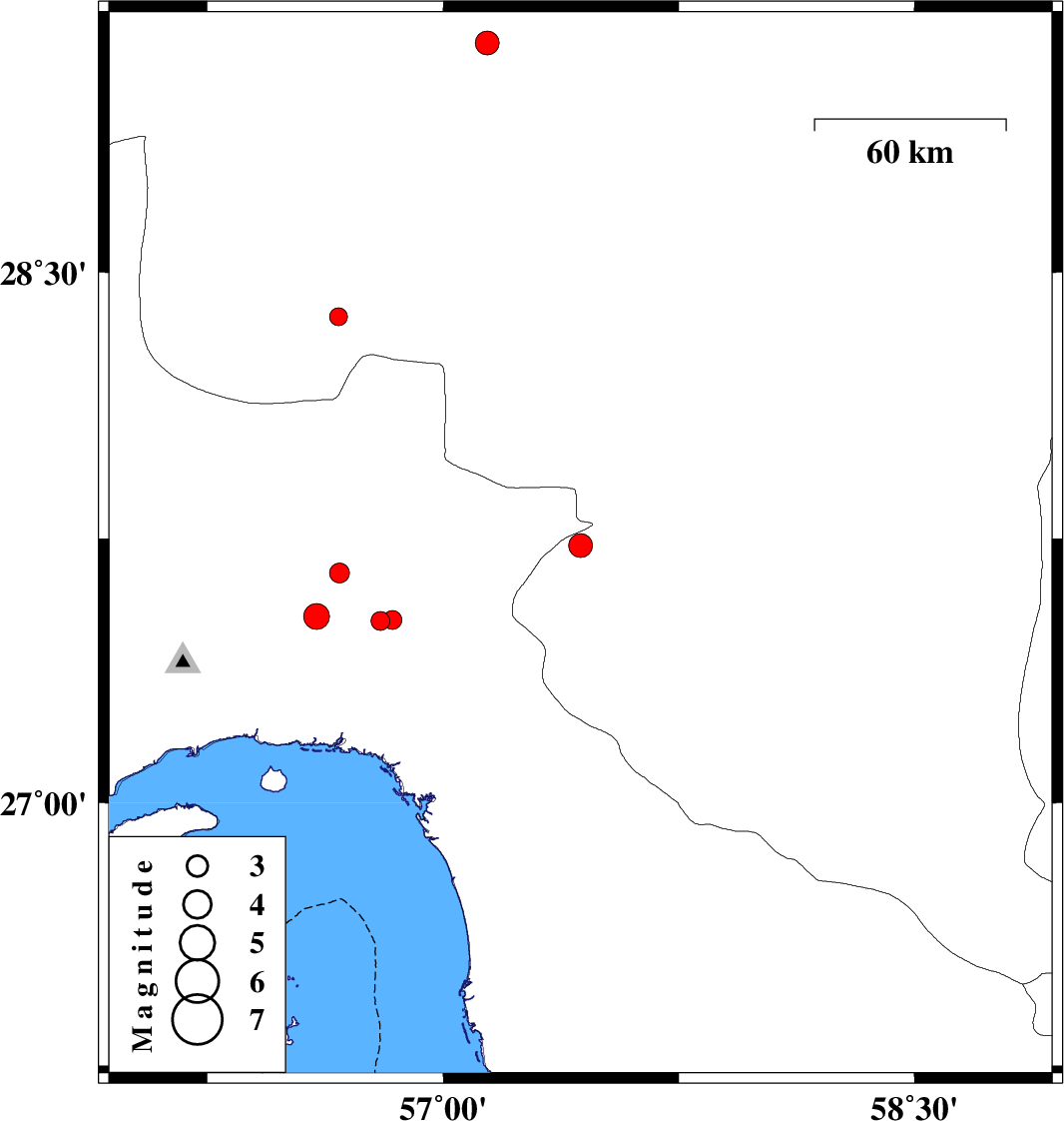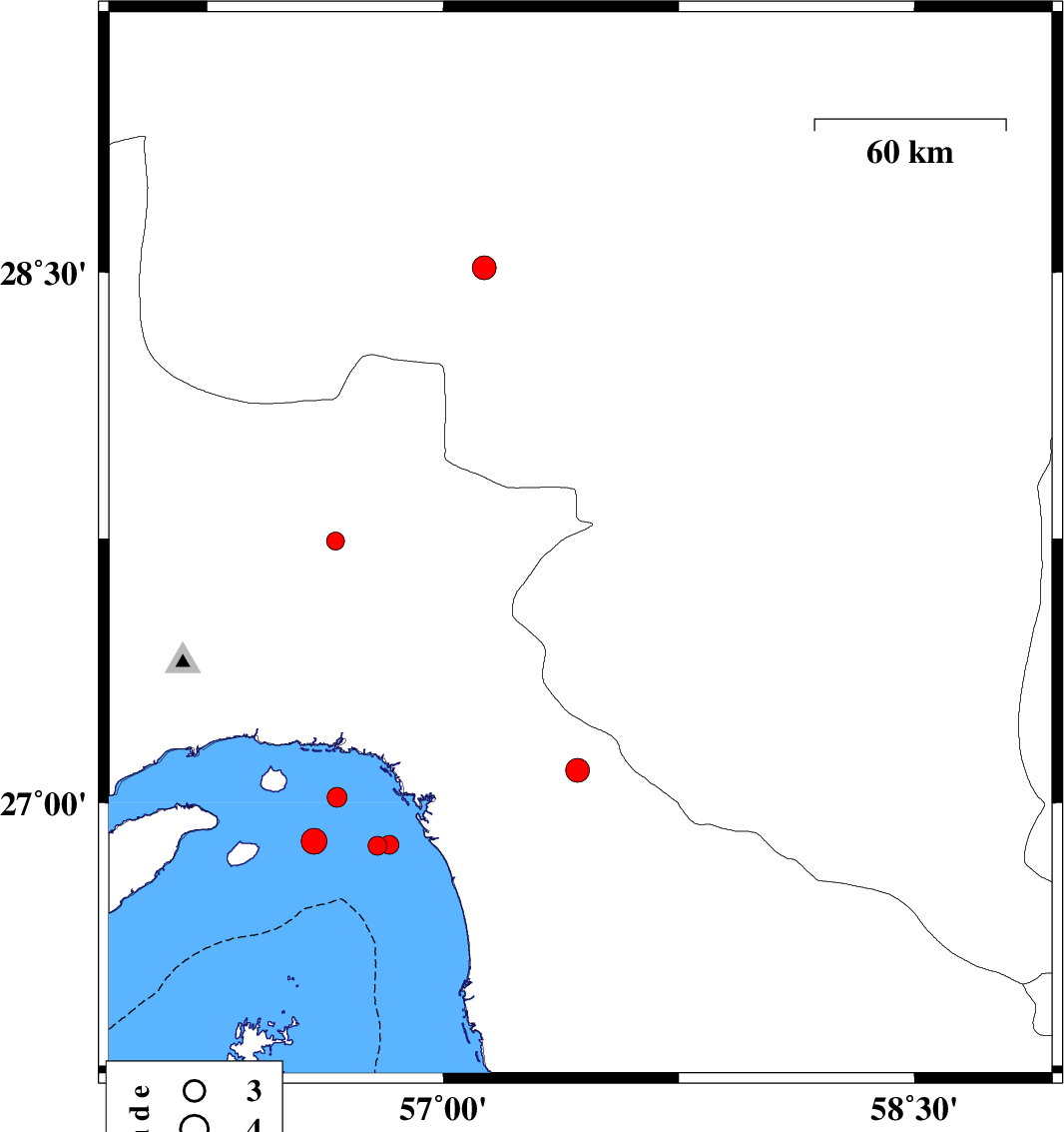 | 2018/04/04 | 08:44:34.3 | 13:14:34.3 | 27.517 | 56.8 | 14 | ML2.7 | Hormozgan Province, 45 km -West of Dehbarez | ||