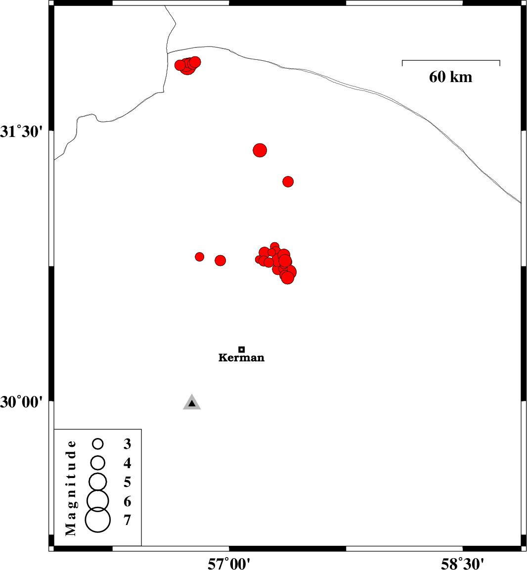 | 2018/03/10 | 15:54:39.5 | 19:24:39.5 | 30.734 | 57.312 | 14 | ML3.2 | Kerman Province, 54 km North-East of Kerman |