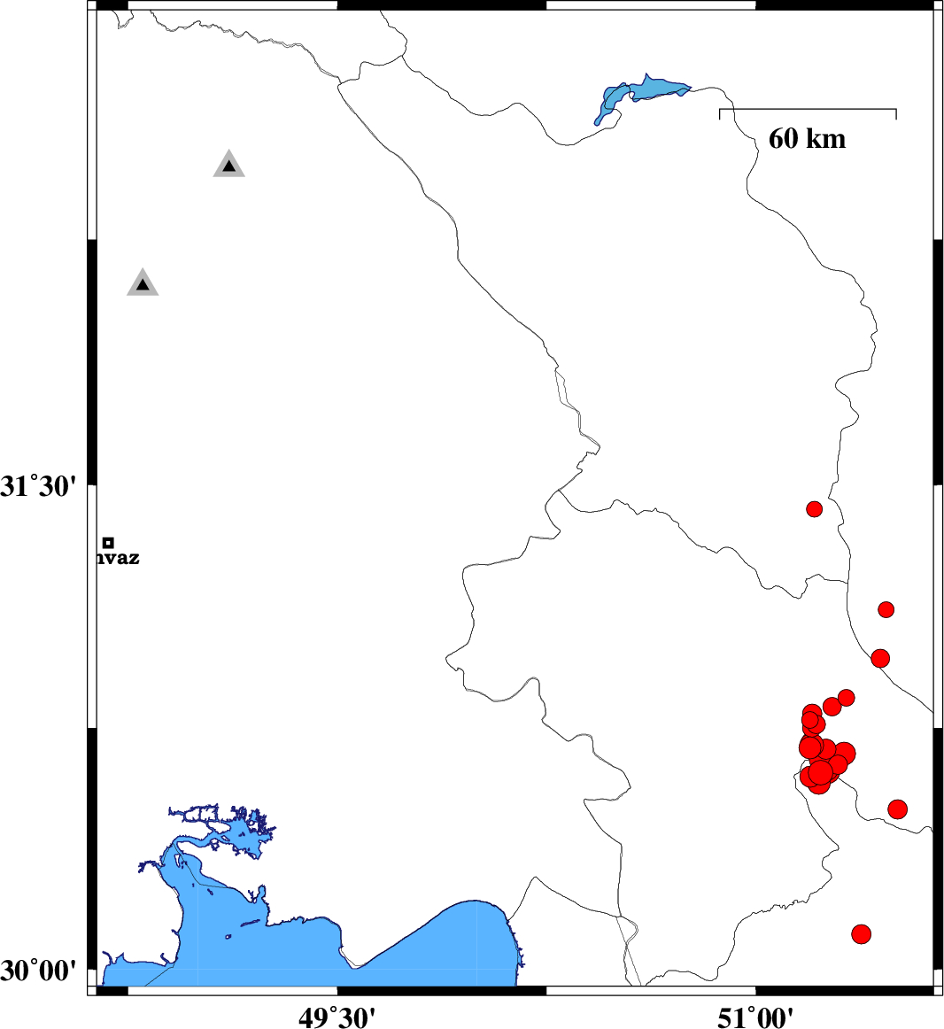 | 2018/03/31 | 07:26:45.3 | 11:56:45.3 | 31.92 | 48.641 | 16 | ML3 | Khoozestan Province, 24 km South-West of Shushtar | ||