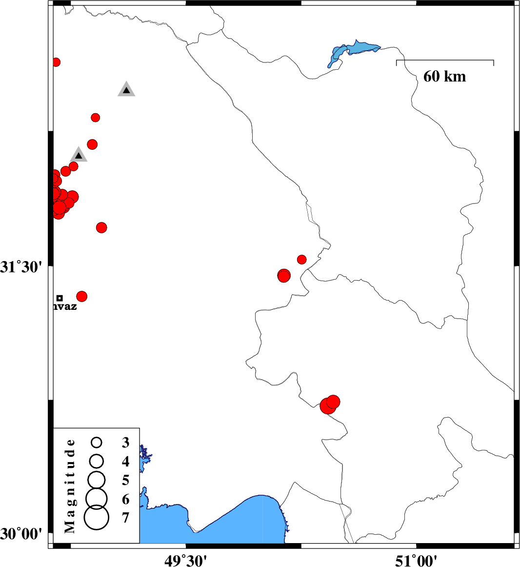 | 2018/03/12 | 01:25:08.3 | 04:55:08.3 | 32.175 | 48.89 | 14 | ML2.9 | Khoozestan Province, 15 km North of Shushtar |