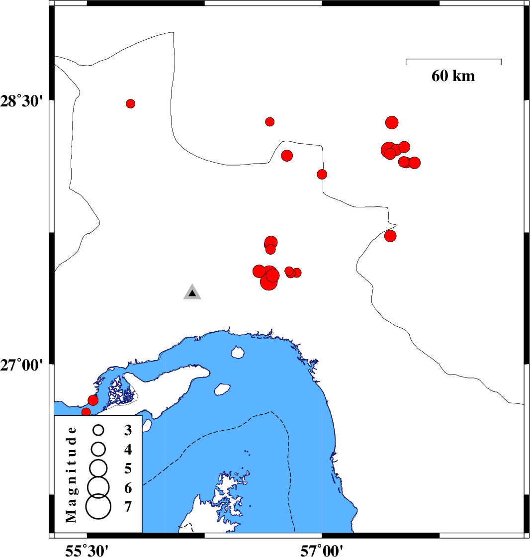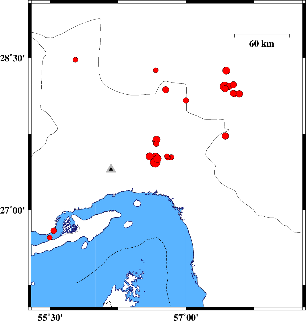 | 2018/03/12 | 06:26:20.7 | 09:56:20.7 | 28.079 | 57 | 18 | ML2.8 | Hormozgan Province, 70 km North-West of Kahnuj | ||