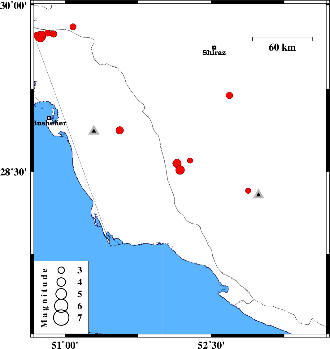 | 2018/03/19 | 06:17:10.8 | 09:47:10.8 | 29.741 | 50.882 | 14 | ML3.1 | Bushehr Province, 40 km North-East of Bandar-e genaveh | ||