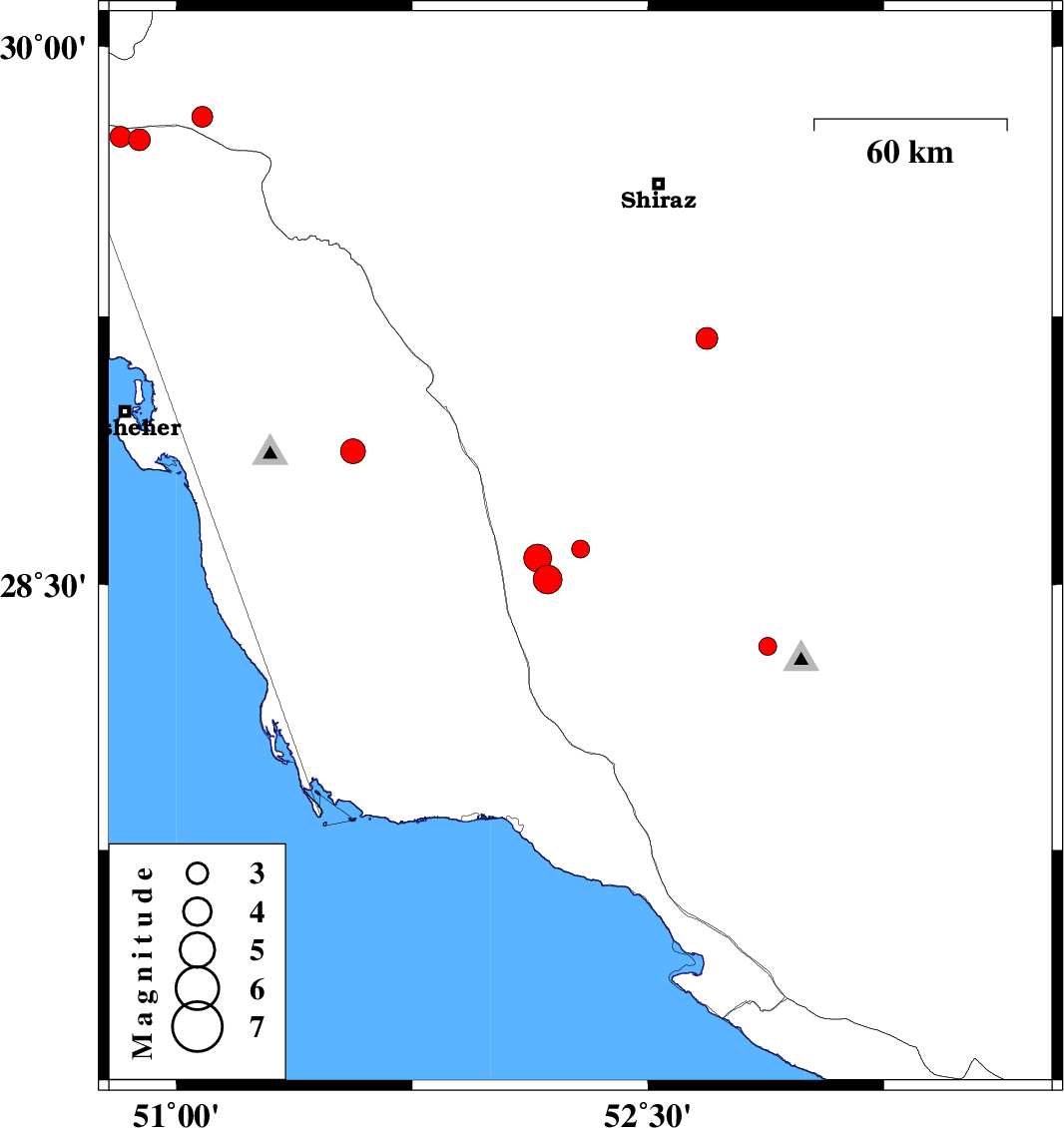 | 2018/03/19 | 06:17:10.8 | 09:47:10.8 | 29.741 | 50.882 | 14 | ML3.1 | Bushehr Province, 40 km North-East of Bandar-e genaveh | ||