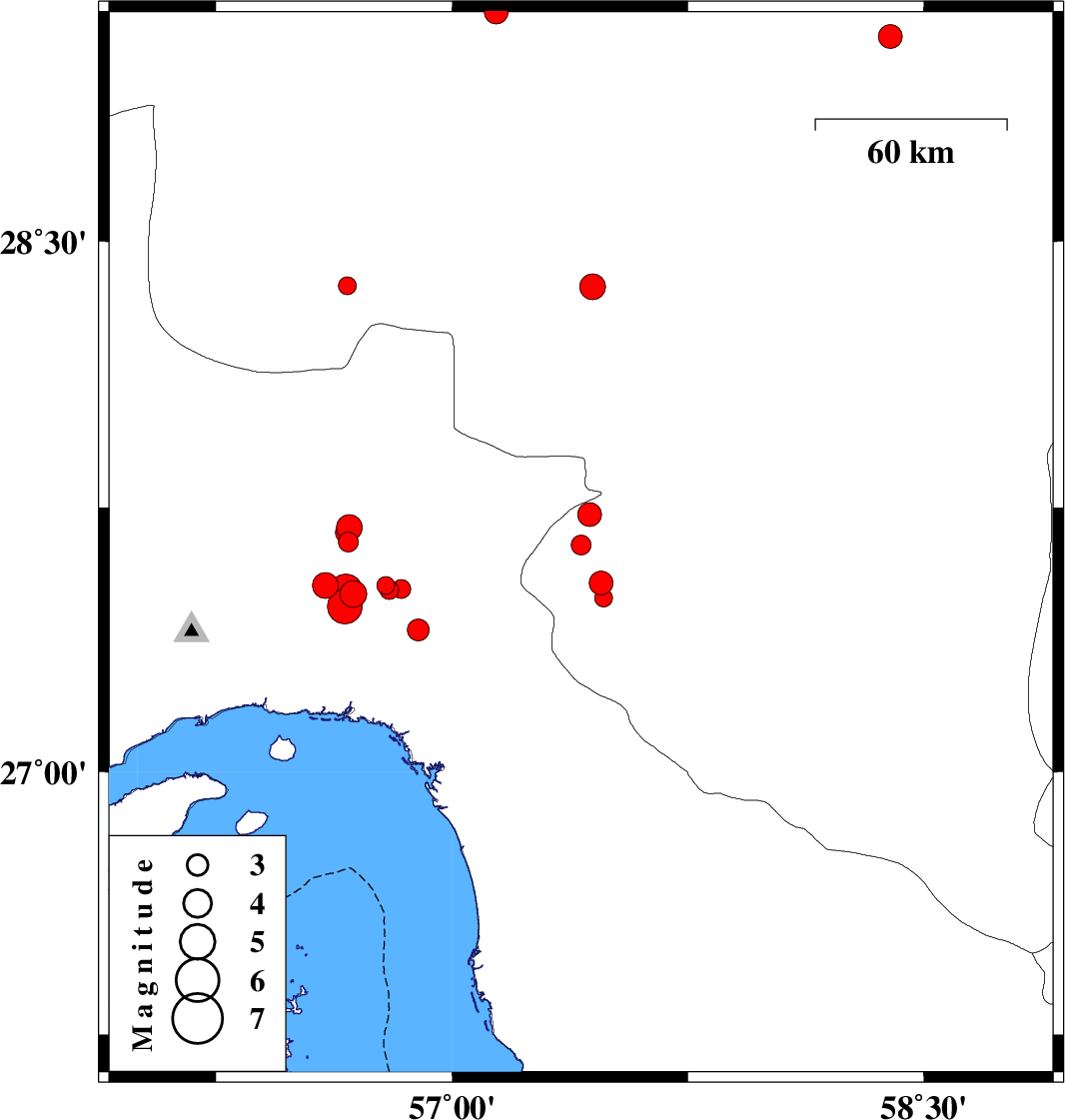 | 2018/03/13 | 18:21:58.0 | 21:51:58.0 | 27.68 | 56.663 | 14 | ML3 | Hormozgan Province, 63 km North-West of Dehbarez |