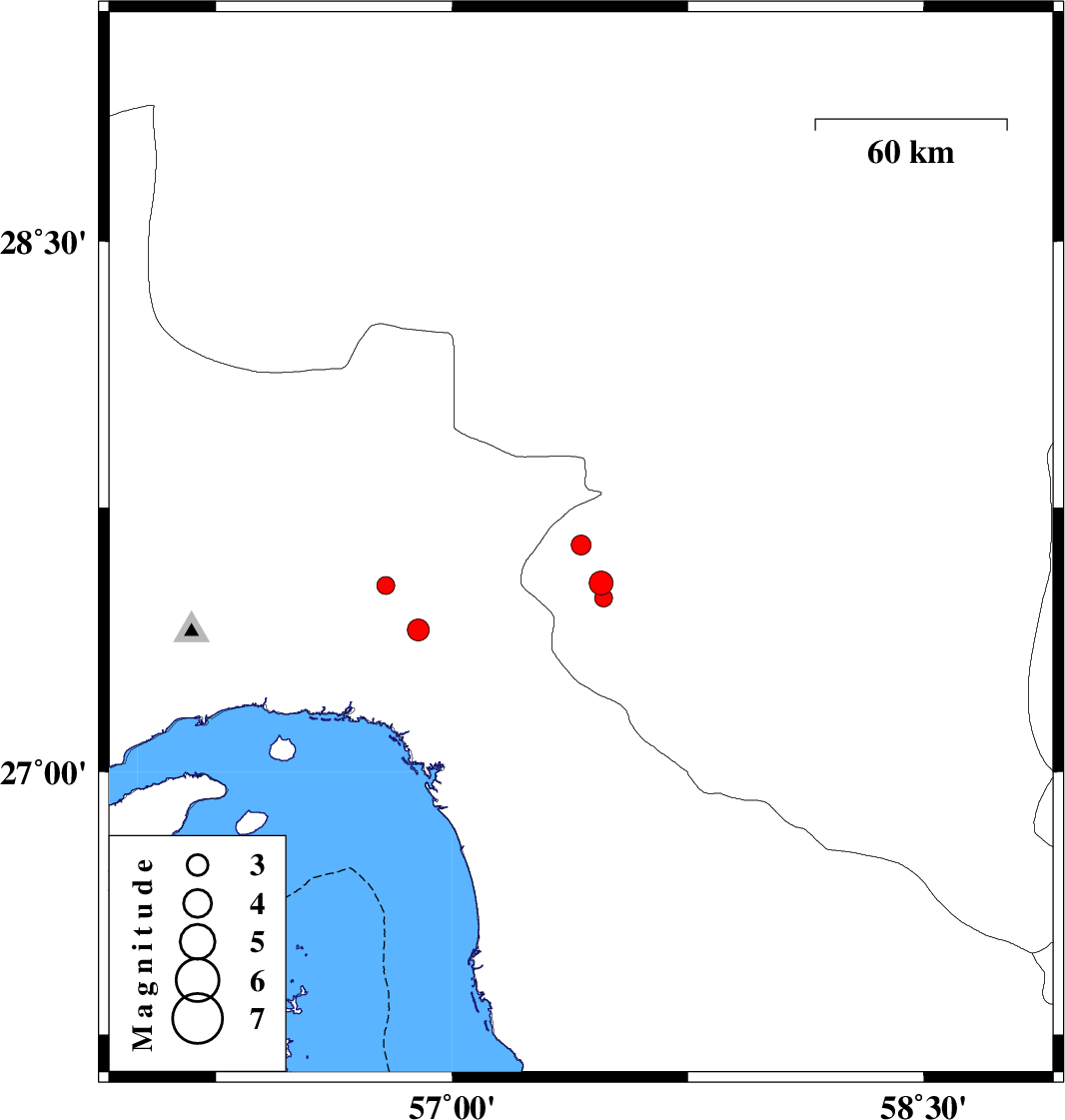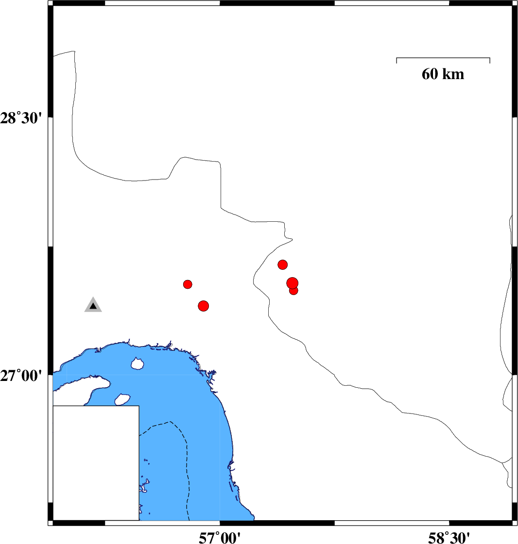| 2018/04/05 | 04:24:37.3 | 08:54:37.3 | 27.53 | 56.79 | 11 | ML2.6 | Hormozgan Province, 46 km North-West of Dehbarez |