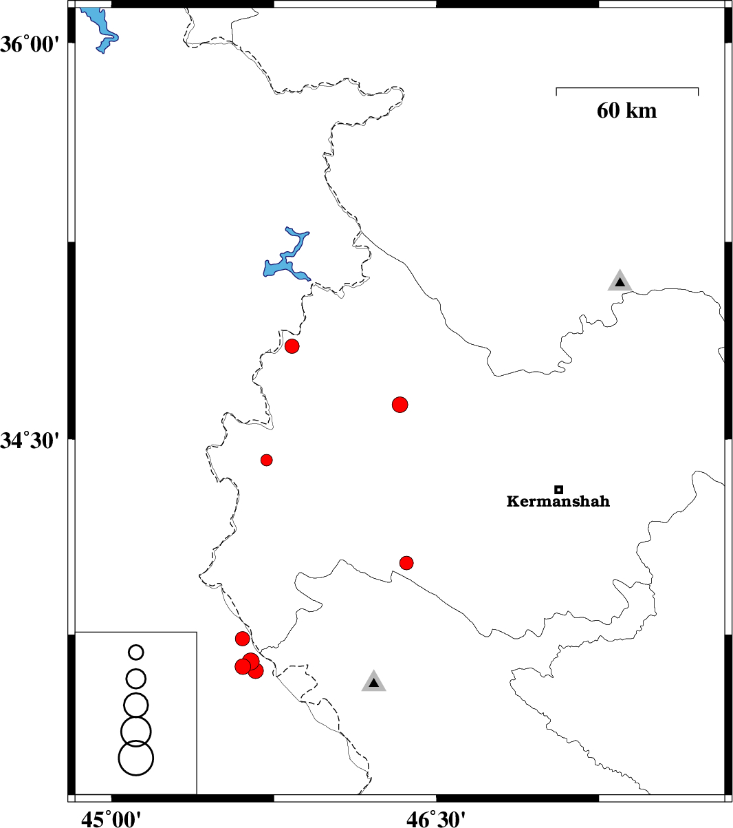 2018/04/15 | 14:49:16.7 | 19:19:16.7 | 34.025 | 46.361 | 14 | ML2.8 | Kermanshah Province, 23 km North of Eyvan |