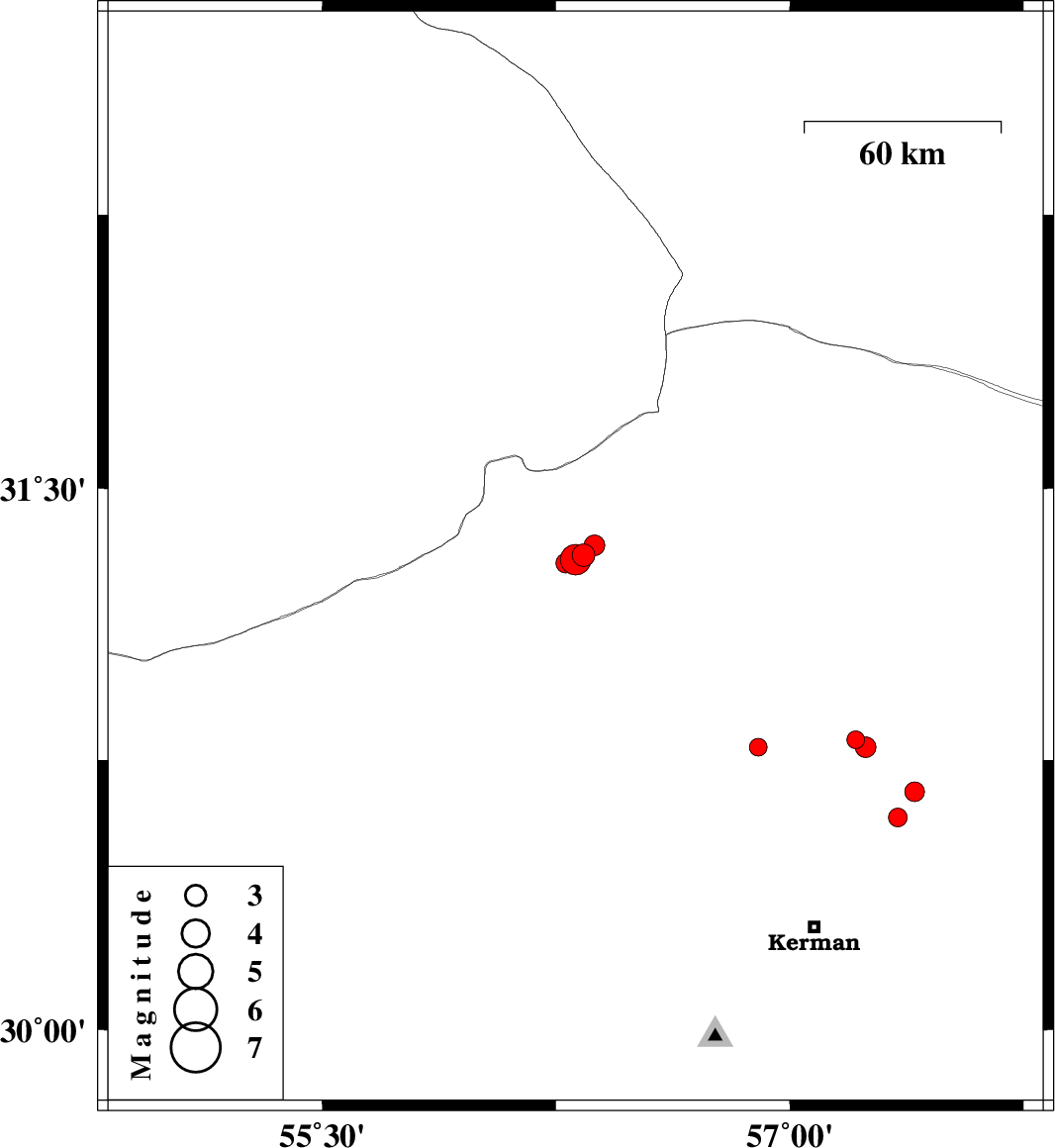 | 2018/04/19 | 05:45:23.9 | 10:15:23.9 | 30.786 | 57.244 | 14 | ML2.9 | Kerman Province, 58 km North-East of Kerman | ||