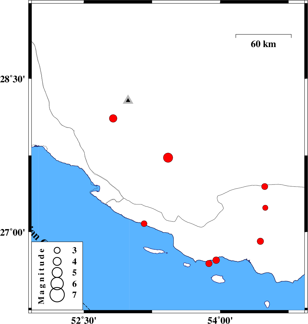 | 2018/04/19 | 23:02:18.2 | 03:32:18.2 | 26.688 | 53.875 | 14 | ML3.2 | Persian Gulf, 75 km South-West of Bastak | ||