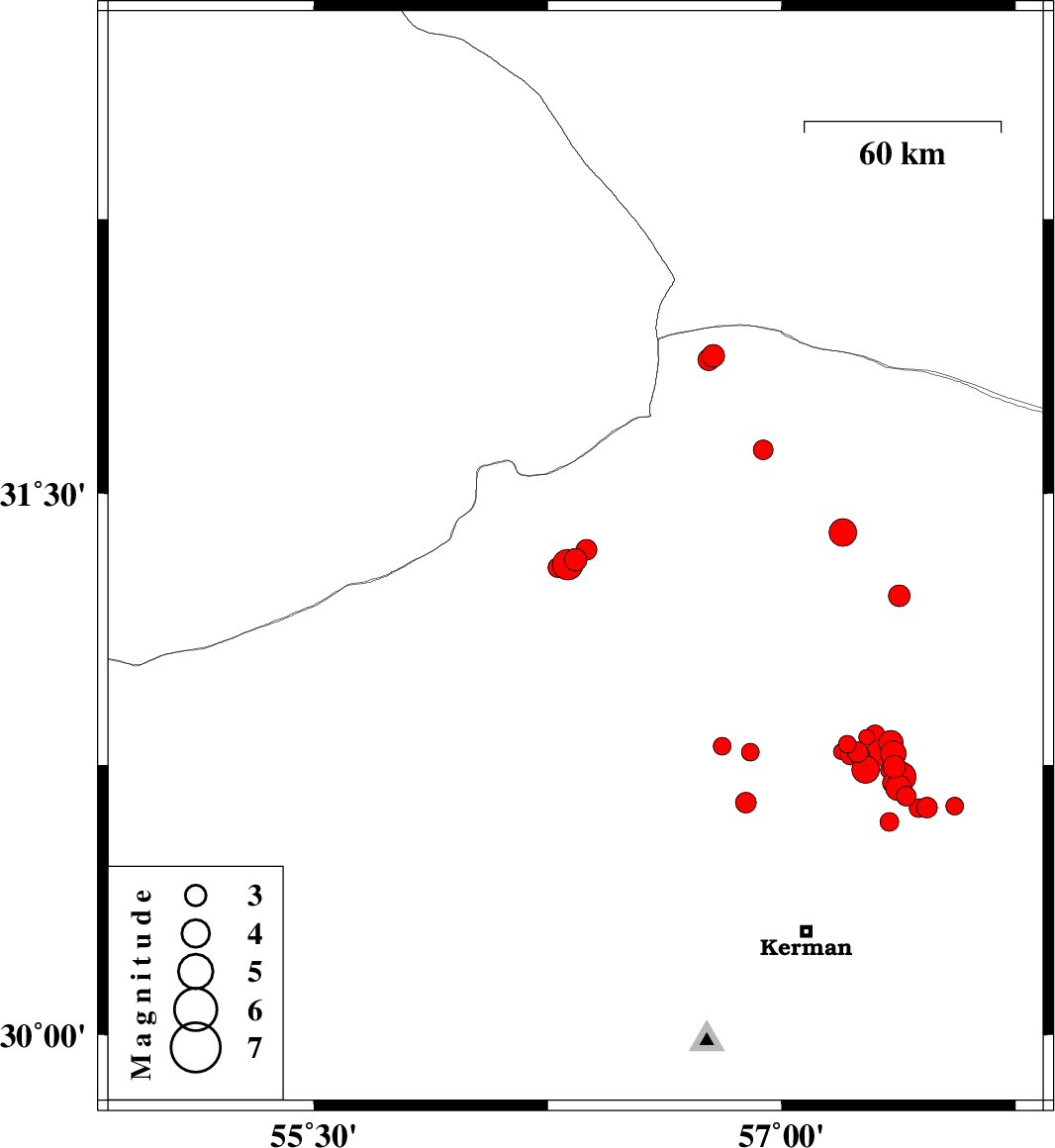 | 2018/04/19 | 05:45:23.9 | 10:15:23.9 | 30.786 | 57.244 | 14 | ML2.9 | Kerman Province, 58 km North-East of Kerman | ||