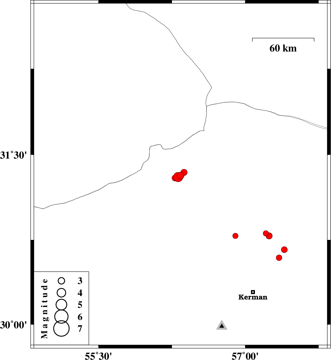 | 2018/04/19 | 05:45:23.9 | 10:15:23.9 | 30.786 | 57.244 | 14 | ML2.9 | Kerman Province, 58 km North-East of Kerman | ||