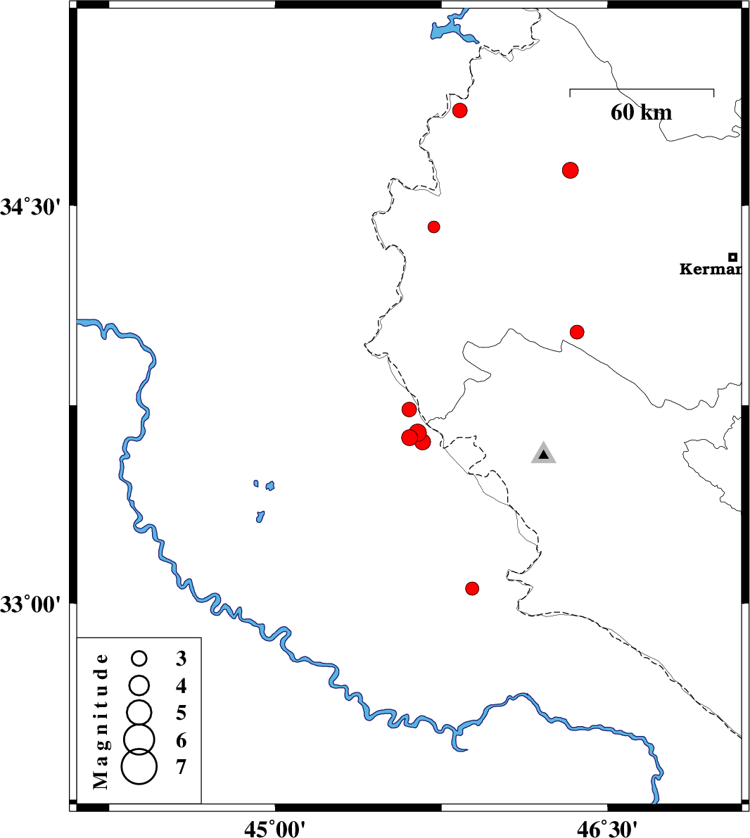 2018/04/19 13:47:30.5 18:17:30.5 33.05645.88910 ML2.7 Iraq, 27 km -West of Mehran