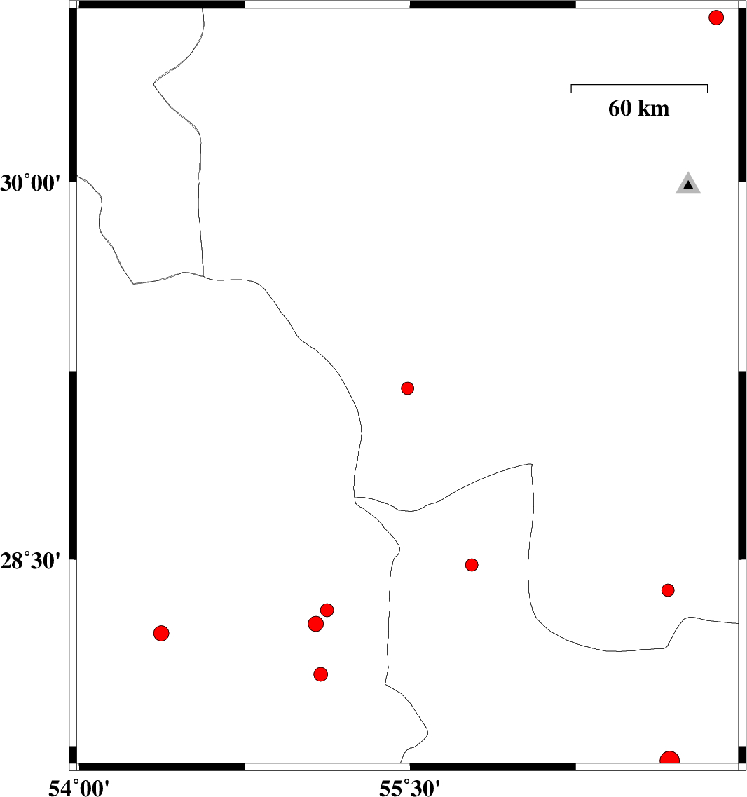 2018/04/16 | 01:54:18.7 | 06:24:18.7 | 28.039 | 55.095 | 14 | ML2.8 | Fars Province, 85 km South-West of Hajiabad | ||