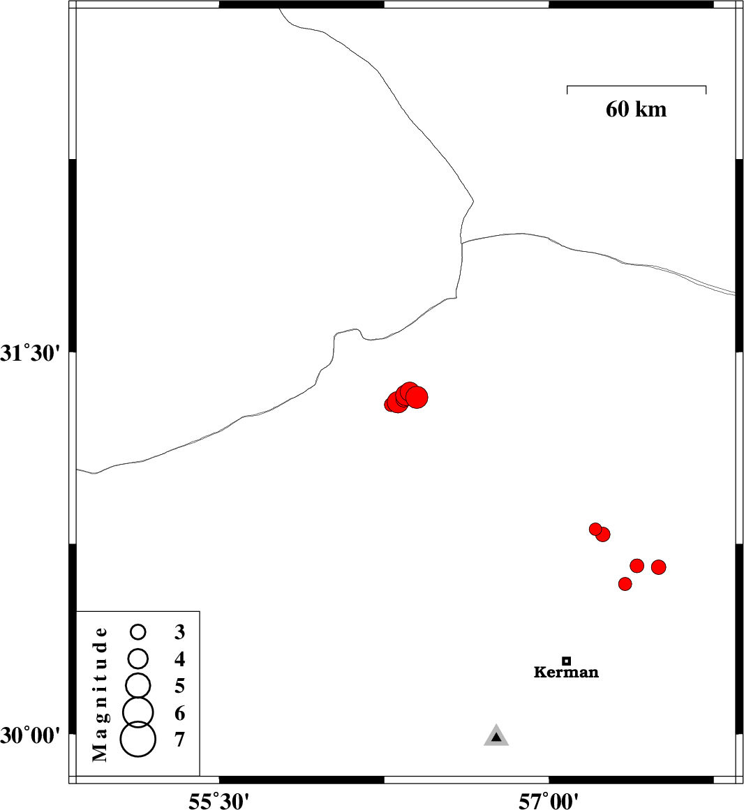 | 2018/04/16 | 14:38:48.4 | 19:08:48.4 | 30.592 | 57.346 | 8 | ML2.7 | Kerman Province, 42 km North-East of Kerman |