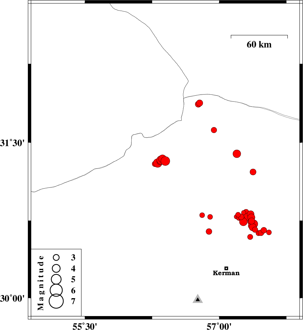 | 2018/04/04 | 22:12:39.1 | 02:42:39.1 | 30.7 | 57.357 | 14 | ML3 | Kerman Province, 53 km North-East of Kerman | ||