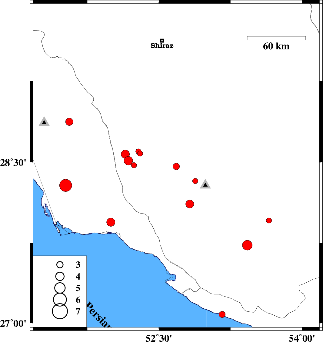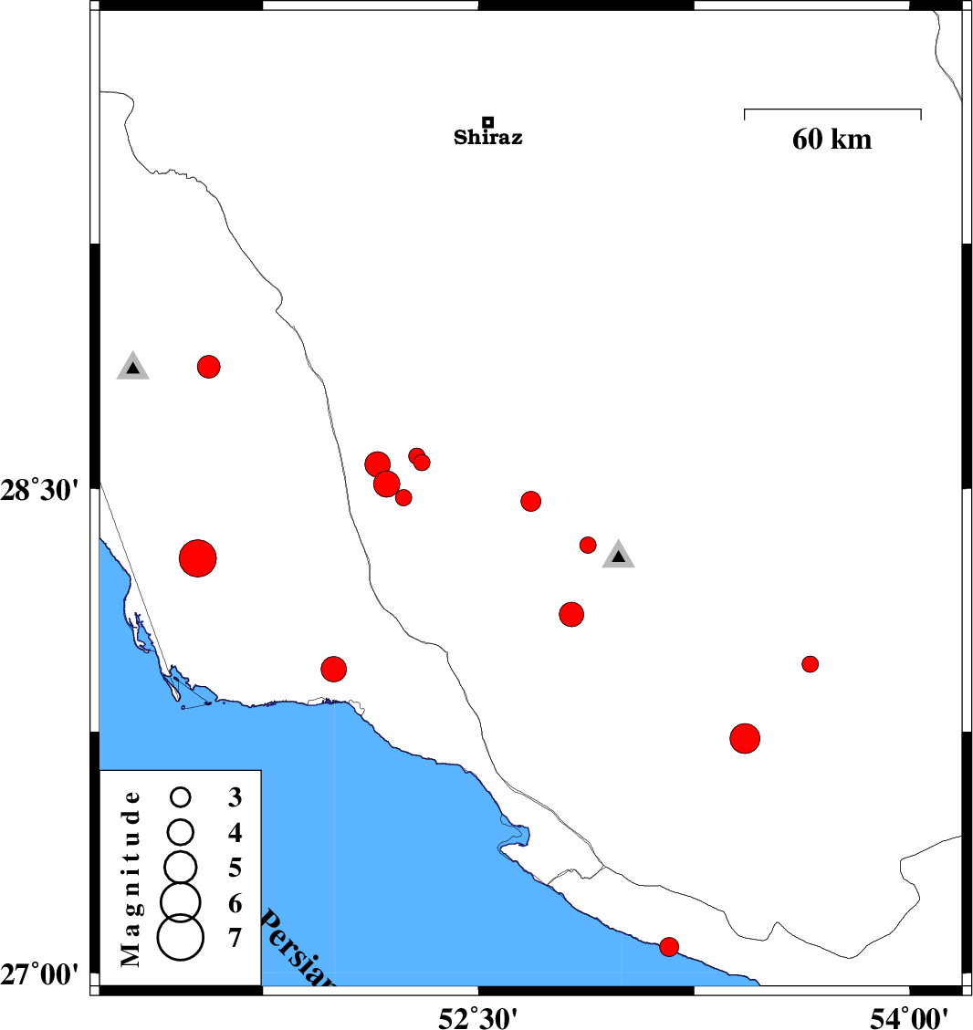 | 2018/04/19 | 06:34:45.3 | 11:04:45.3 | 28.285 | 51.524 | 14 | Mw5.8 | Bushehr Province, 43 km South-East of Khormog | ||