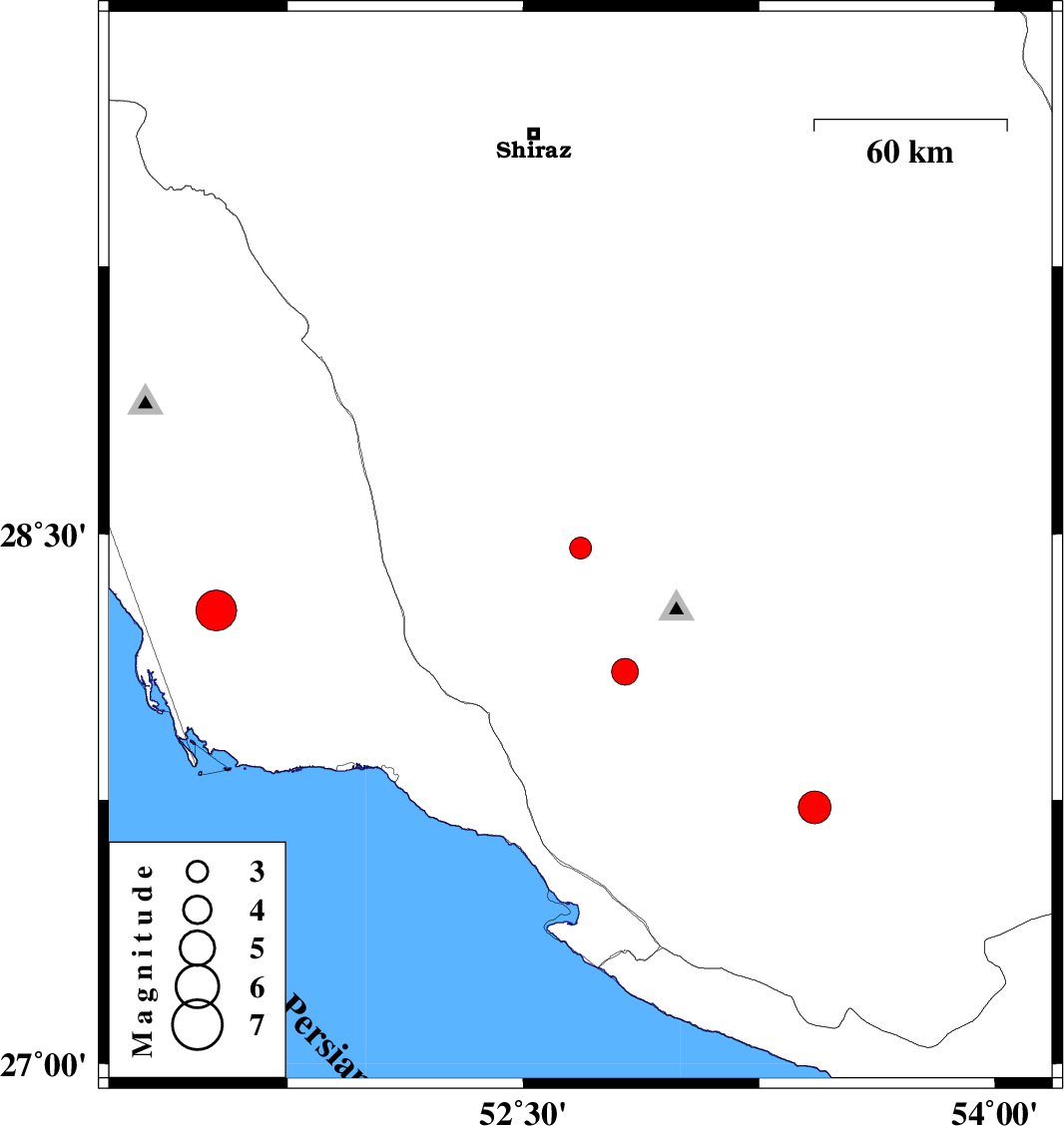 | 2018/04/19 | 06:34:45.3 | 11:04:45.3 | 28.285 | 51.524 | 14 | Mw5.8 | Bushehr Province, 43 km South-East of Khormog | ||