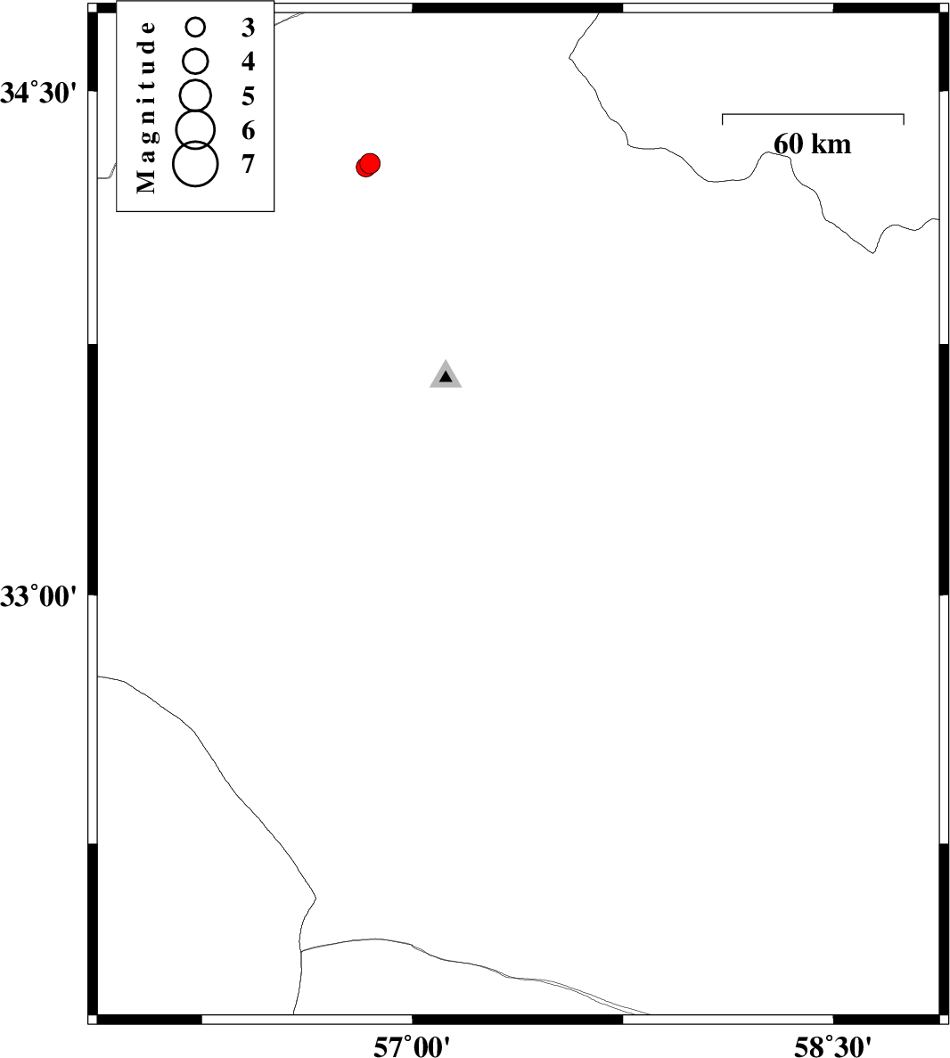 | 2018/04/06 | 10:14:50.2 | 14:44:50.2 | 33.371 | 57.44 | 11 | ML3.1 | Yazd Province, 54 km South-East of Tabas | ||