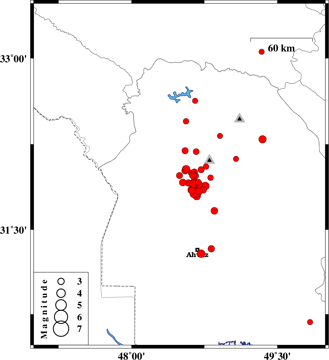 2018/04/02 | 23:25:31.5 | 03:55:31.5 | 31.843 | 48.62 | 15 | ML:3.1 | Khoozestan Province, 31 km South-West of Shushtar | ||