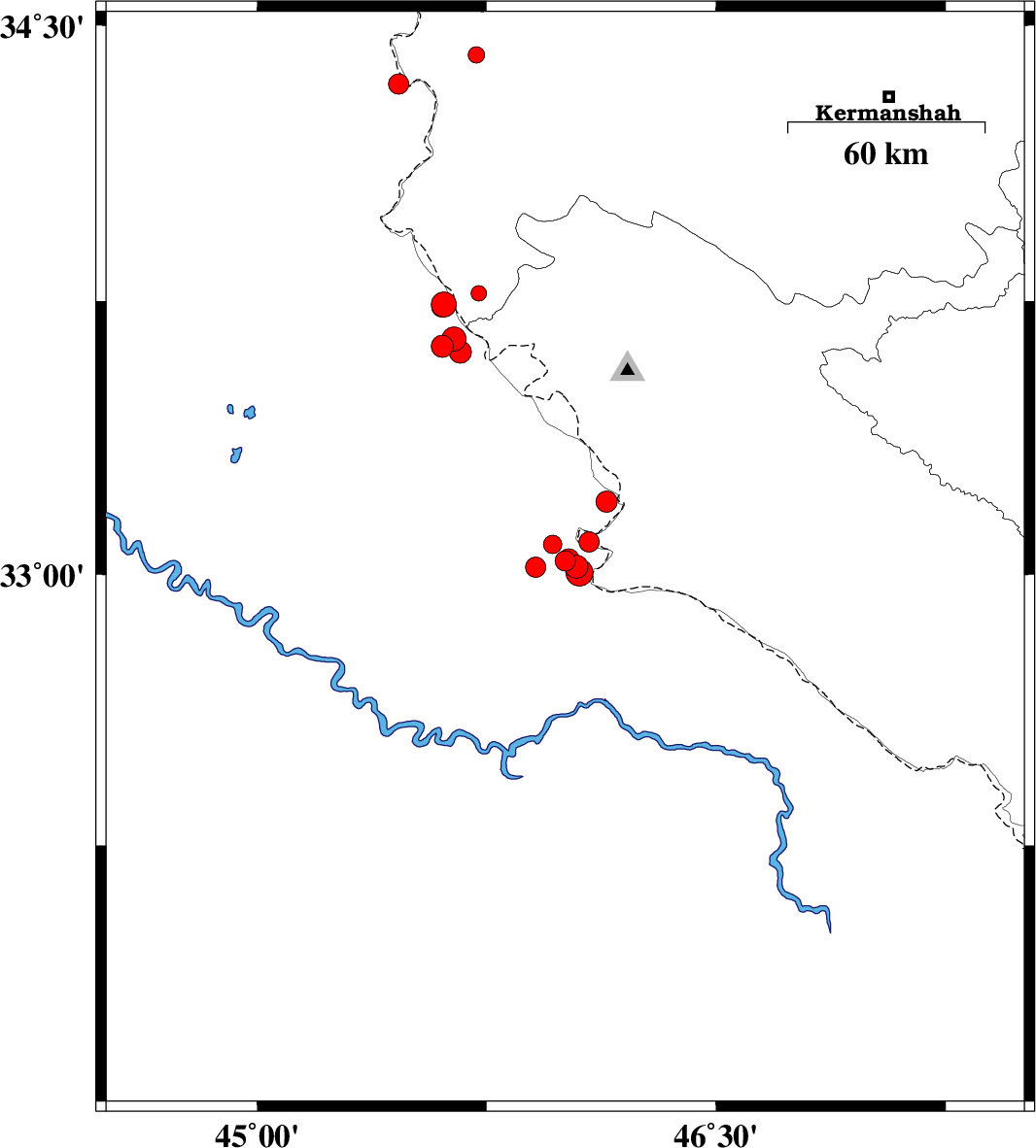 | 2018/04/27 | 03:04:31.4 | 07:34:31.4 | 34.34 | 45.462 | 14 | ML3 | Iraq, 23 km South-West of Qasr-E-Shirin | ||