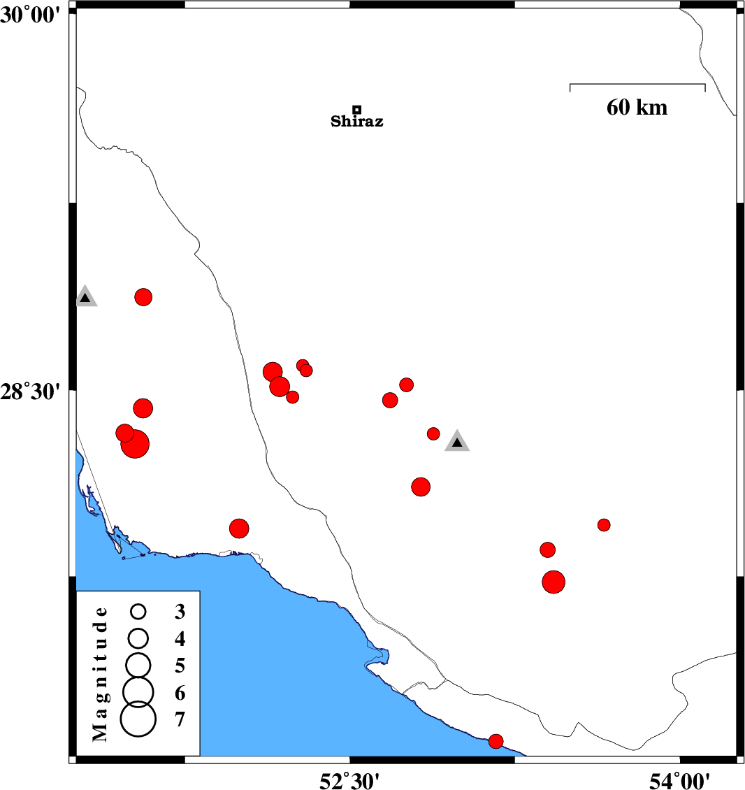 | 2018/04/19 | 06:34:45.3 | 11:04:45.3 | 28.285 | 51.524 | 14 | Mw5.8 | Bushehr Province, 43 km South-East of Khormog | ||