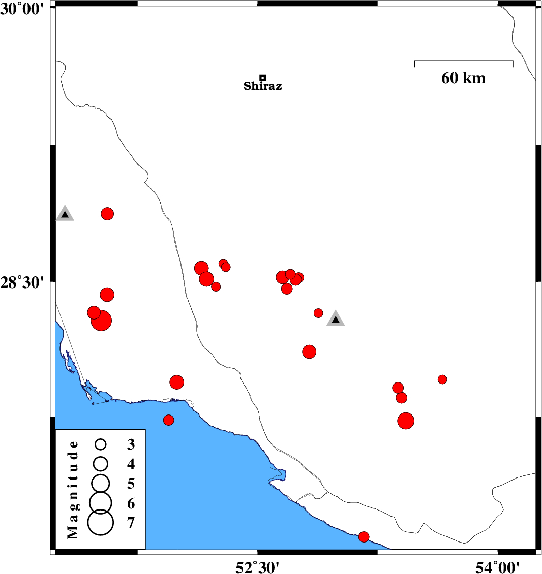 | 2018/04/19 | 06:34:45.3 | 11:04:45.3 | 28.285 | 51.524 | 14 | Mw5.8 | Bushehr Province, 43 km South-East of Khormog | ||