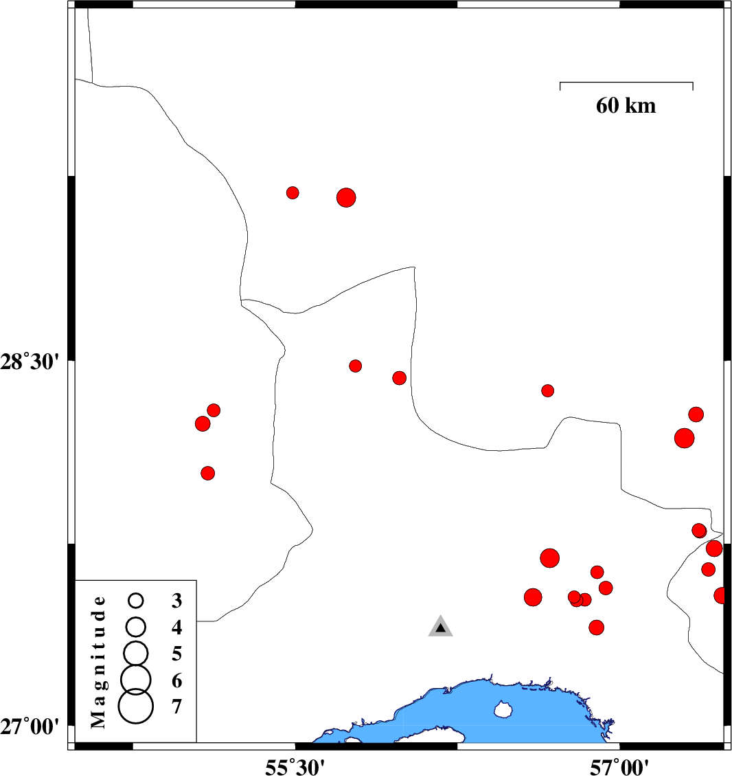 | 2018/04/21 | 03:02:05.0 | 07:32:05.0 | 27.567 | 56.935 | 14 | ML2.8 | Hormozgan Province, 34 km North-West of Dehbarez | ||