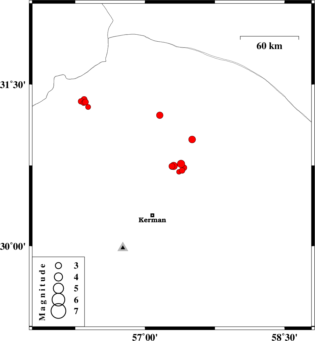 | 2018/04/26 | 14:19:04.1 | 18:49:04.1 | 30.746 | 57.307 | 14 | ML3.6 | Kerman Province, 55 km North-East of Kerman | ||