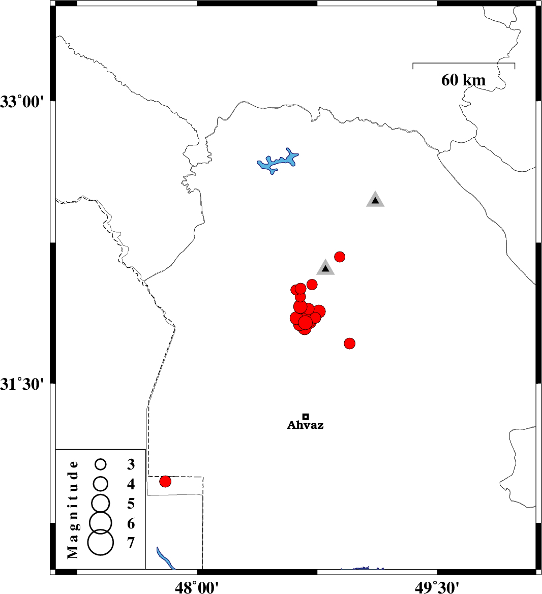 | 2018/03/28 | 11:59:42.9 | 16:29:42.9 | 31.795 | 48.67 | 15 | ML3.7 | Khoozestan Province, 32 km South-West of Shushtar | ||