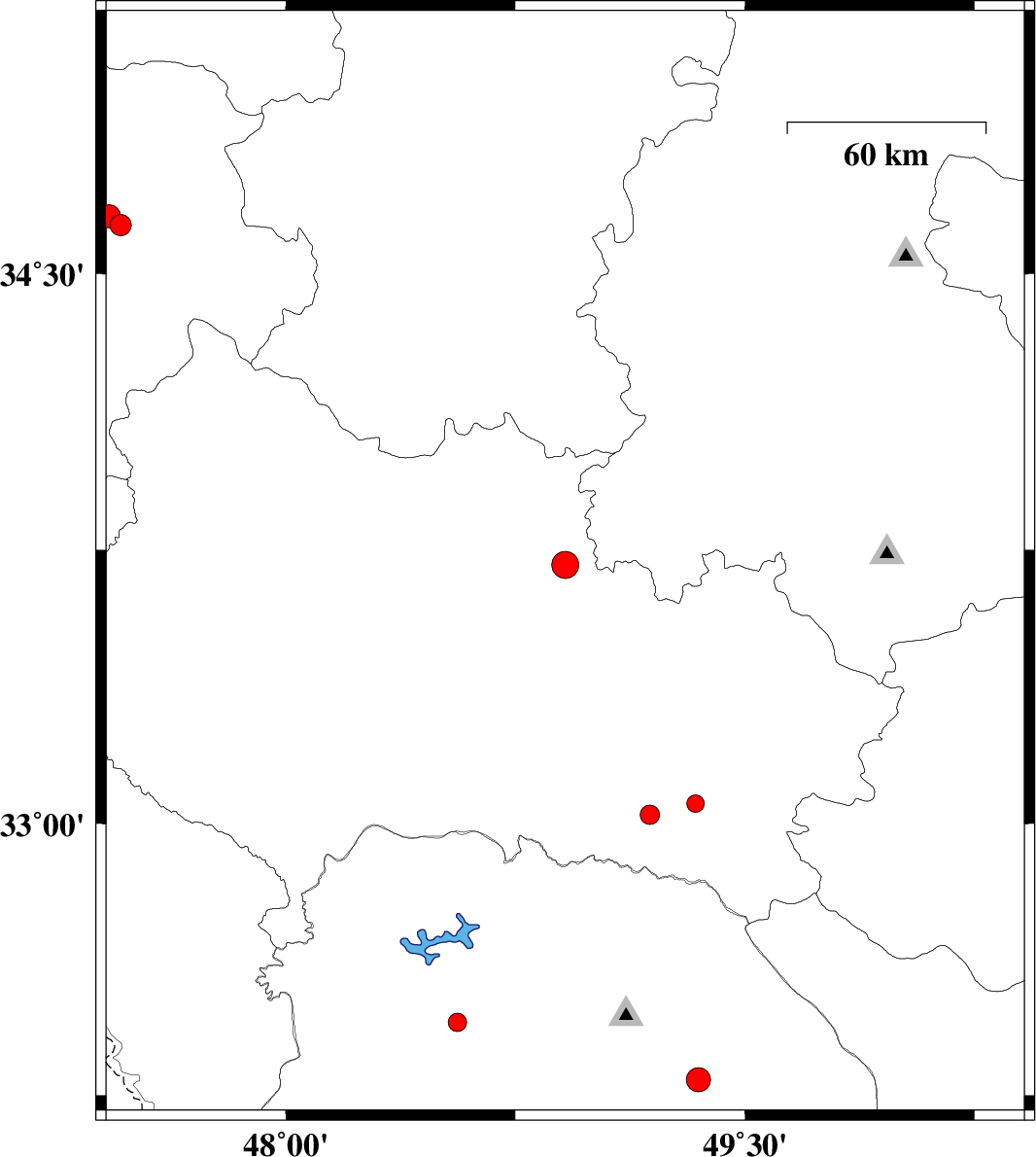 | 2018/04/30 | 14:43:57.4 | 19:13:57.4 | 33.024 | 49.19 | 14 | ML2.8 | Lorestan Province, 52 km South-East of Dorud | ||