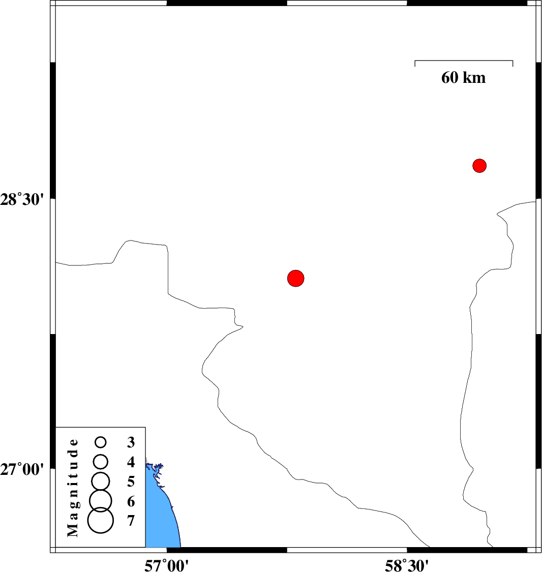 | 2018/05/06 | 08:09:14.8 | 12:39:14.8 | 28.681 | 58.952 | 15 | ML3.8 | Kerman Province, 75 km South-East of Bam |