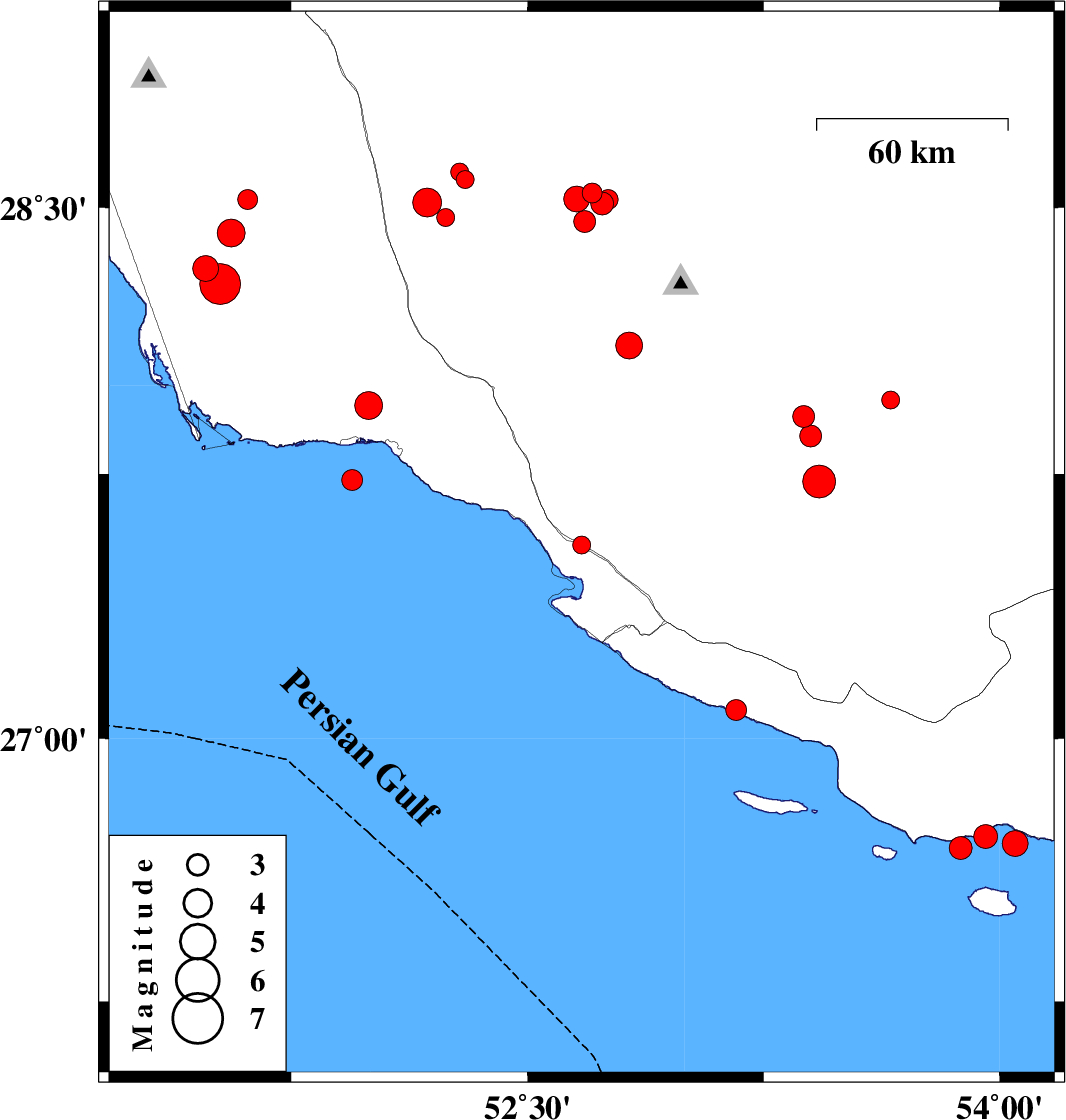 | 2018/04/19 | 06:34:45.3 | 11:04:45.3 | 28.285 | 51.524 | 14 | Mw5.8 | Bushehr Province, 43 km South-East of Khormog | ||