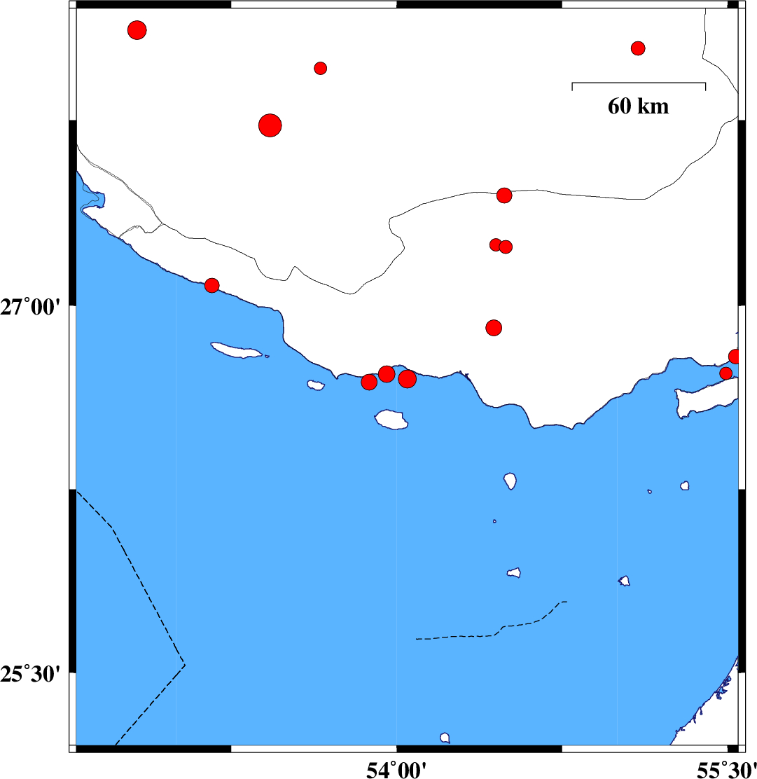 | 2018/04/19 | 04:05:18.2 | 08:35:18.2 | 26.721 | 53.955 | 15 | ML3.4 | , 67 km South-West of Bastak | ||