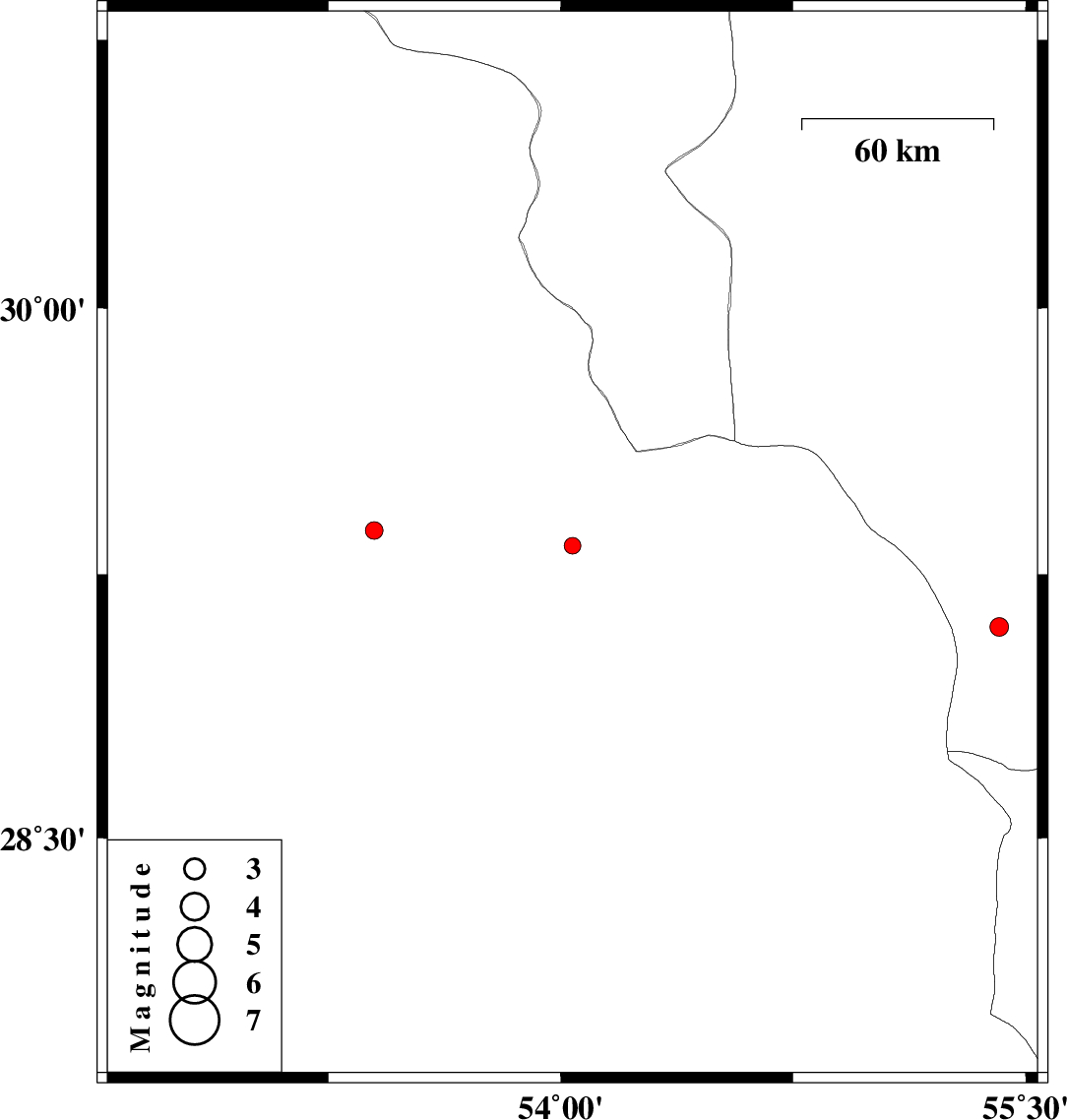 2018/05/10 | 03:03:10.2 | 07:33:10.2 | 28.097 | 52.733 | 14 | ML:2.9 | Fars Province, 50 km South-West of Qir va Karzin | ||
