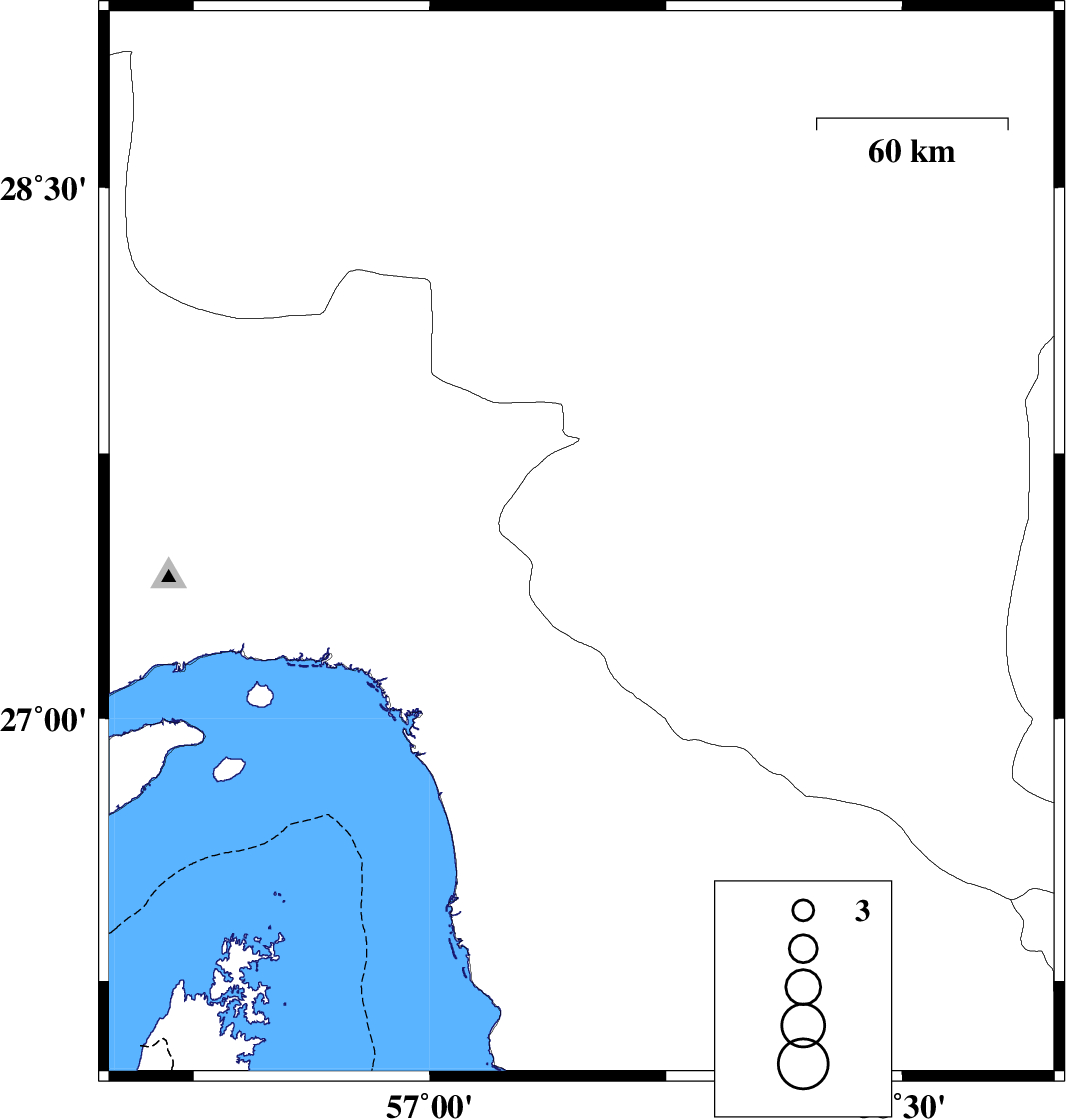 | 2018/04/05 | 04:24:37.3 | 08:54:37.3 | 27.53 | 56.79 | 11 | ML2.6 | Hormozgan Province, 46 km North-West of Dehbarez |