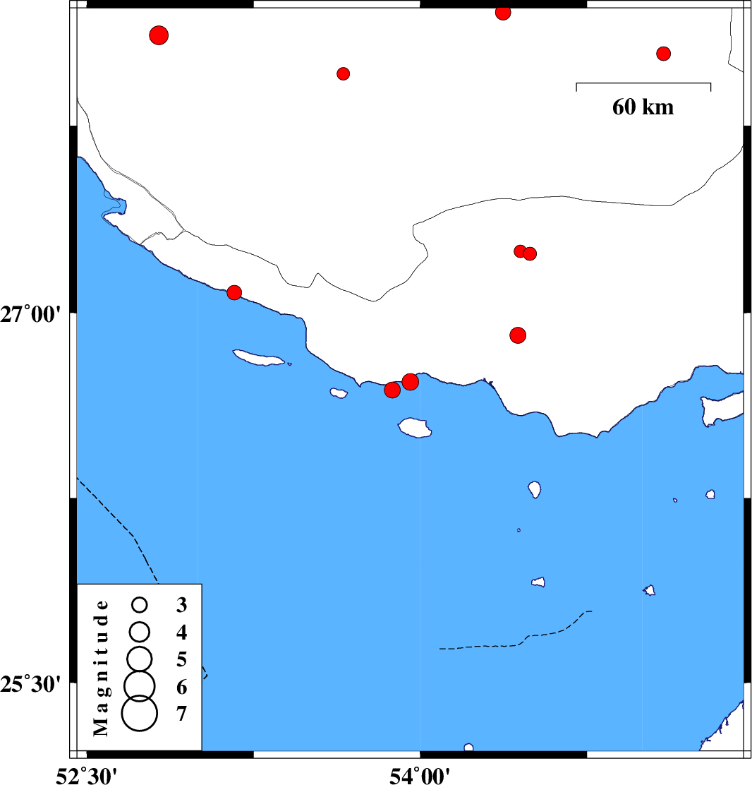 | 2018/04/19 | 04:05:18.2 | 08:35:18.2 | 26.721 | 53.955 | 15 | ML3.4 | , 67 km South-West of Bastak | ||