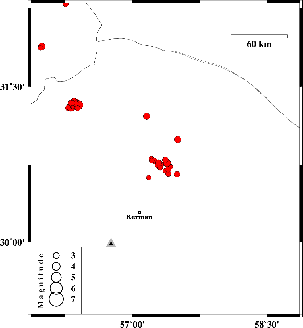 | 2018/04/26 | 14:19:04.1 | 18:49:04.1 | 30.746 | 57.307 | 14 | ML3.6 | Kerman Province, 55 km North-East of Kerman | ||