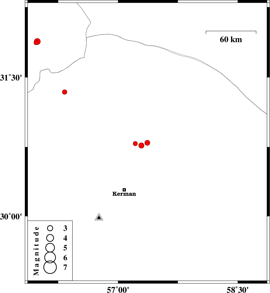| 2018/05/17 | 10:18:29.6 | 14:48:29.6 | 30.796 | 57.367 | 15 | ML2.9 | Kerman Province, 63 km North-East of Kerman | ||