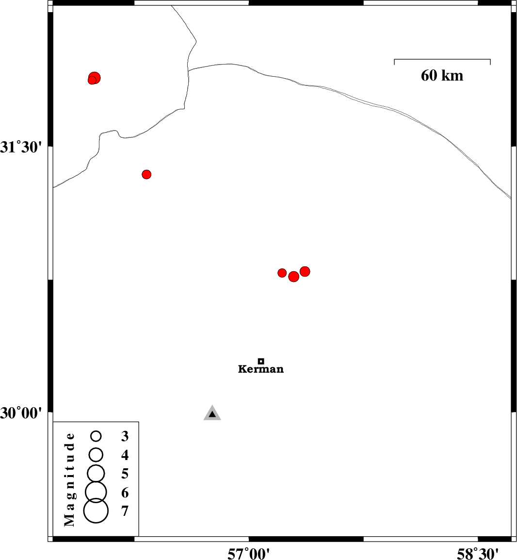 | 2018/05/17 | 10:18:29.6 | 14:48:29.6 | 30.796 | 57.367 | 15 | ML2.9 | Kerman Province, 63 km North-East of Kerman | ||