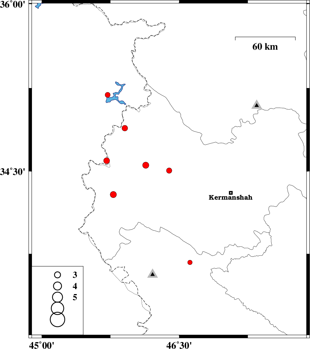 | 2018/05/12 | 17:11:33.3 | 21:41:33.3 | 34.29 | 45.782 | 15 | ML3.1 | Kermanshah Province, 20 km North-West of Gilan-E-Gharb |