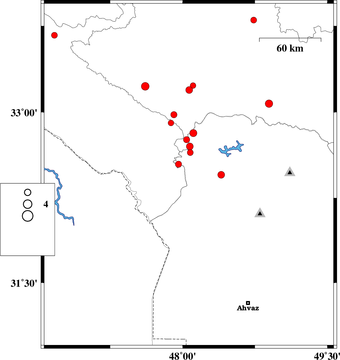 | 2018/05/17 | 00:03:45.4 | 04:33:45.4 | 32.445 | 48.065 | 15 | ML3.6 | Khoozestan Province, 27 km -West of Andimeshk | ||