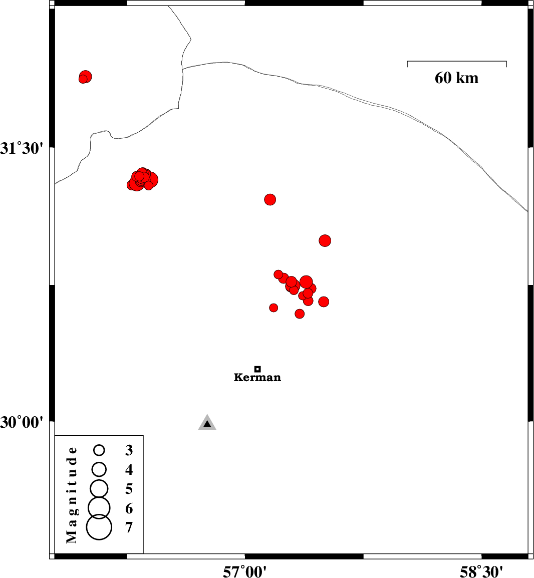 | 2018/04/26 | 14:19:04.1 | 18:49:04.1 | 30.746 | 57.307 | 14 | ML3.6 | Kerman Province, 55 km North-East of Kerman | ||