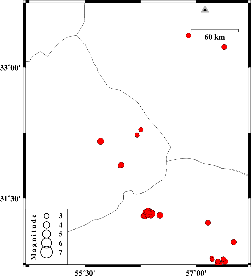 | 2018/04/26 | 08:33:01.3 | 13:03:01.3 | 31.361 | 56.346 | 14 | ML3 | Kerman Province, 46 km -West of Ravar | ||