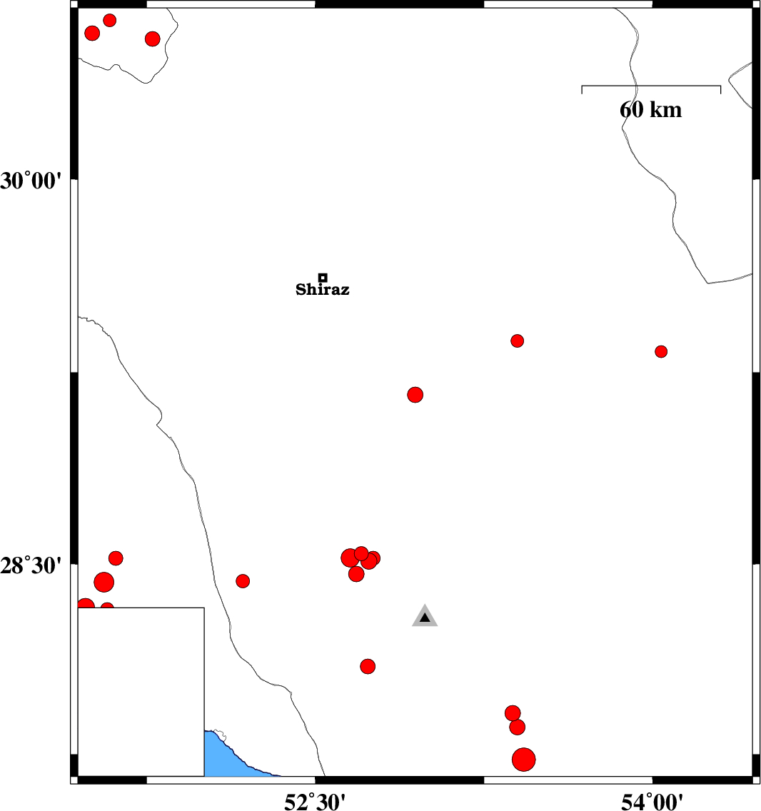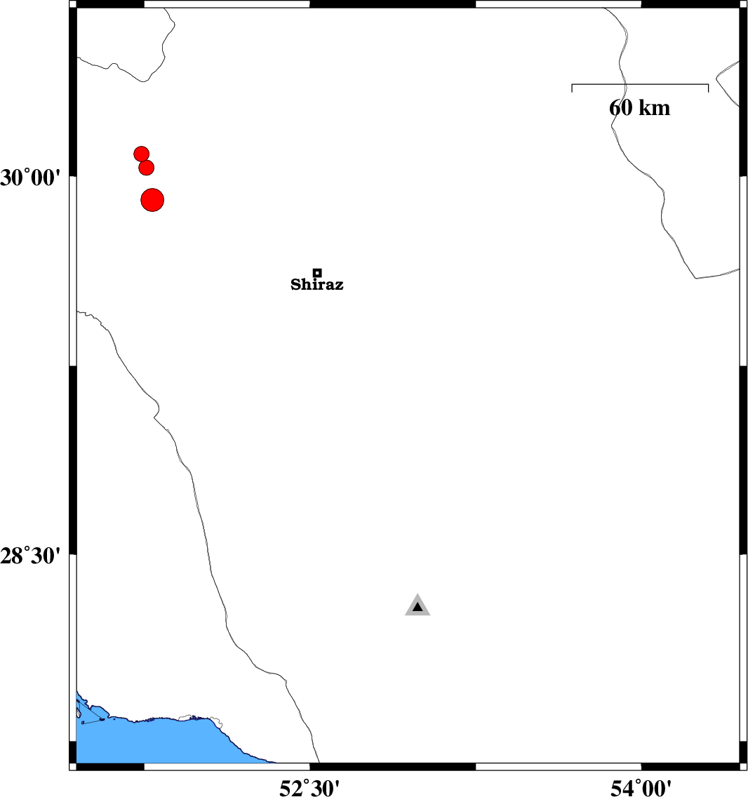 | 2018/05/16 | 15:10:09.3 | 19:40:09.3 | 28.433 | 52.177 | 6 | ML2.7 | Fars Province, 50 km South of Farashband | ||