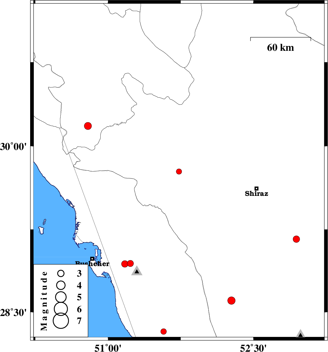 | 2018/05/19 | 13:46:53.5 | 18:16:53.5 | 28.322 | 51.574 | 6 | ML2.7 | Bushehr Province, 42 km South-East of Khormog |