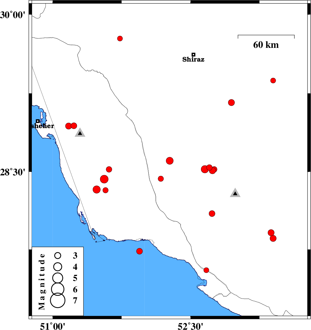 | 2018/05/10 | 03:03:10.2 | 07:33:10.2 | 28.097 | 52.733 | 14 | ML2.9 | Fars Province, 50 km South-West of Qir va Karzin | ||